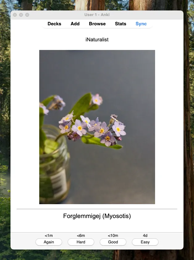 This generates an iNaturalist.md file which, if you run Ankivalenz on it, will create an Anki card for each observation, with the photo on the front and the species name on the back: